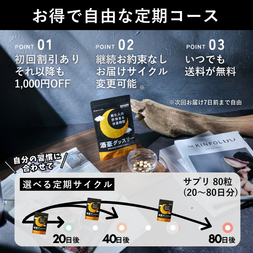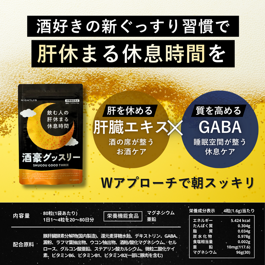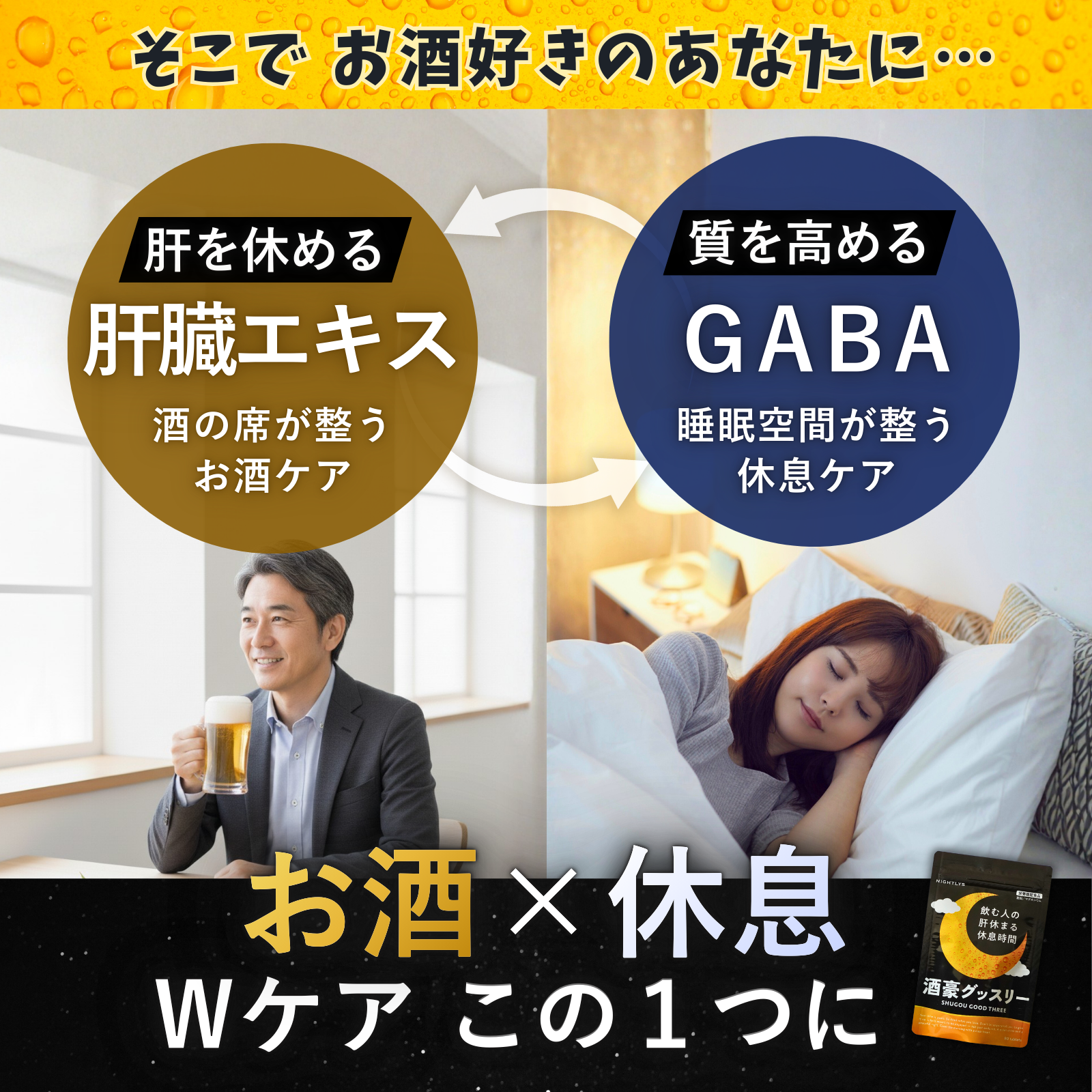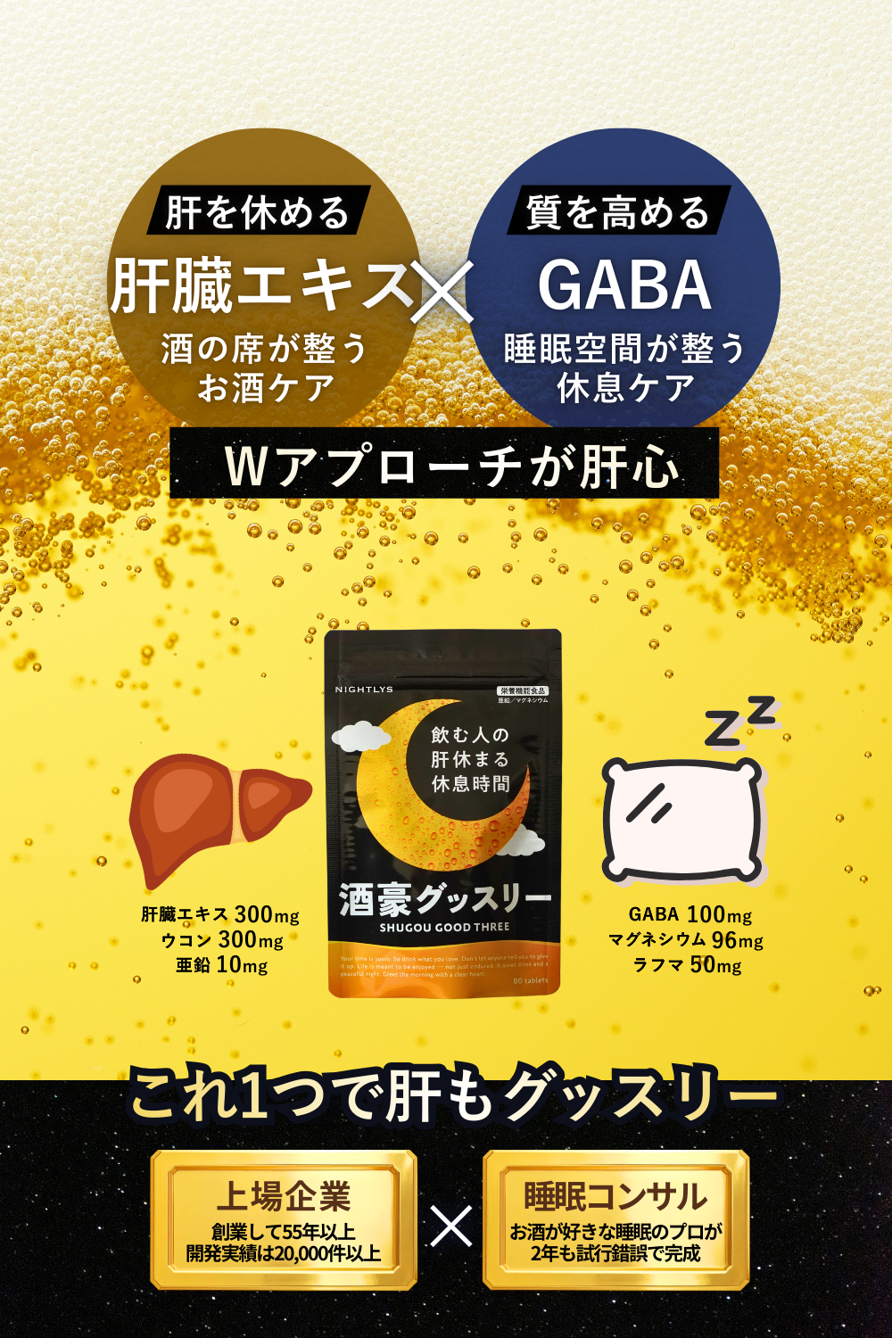 酒豪グッスリーは、“お酒を楽しむ” と “夜のグッスリー” を同時にサポートするサプリメントです。
