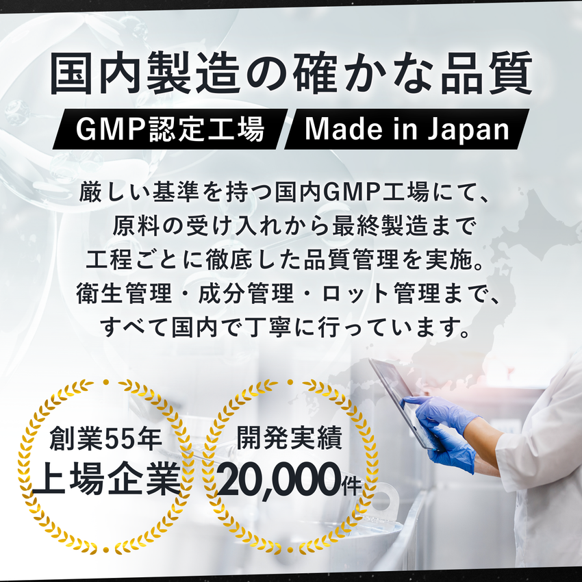 創業55年以上、2万件以上の開発実績を持つ商品開発専門の上場企業(国内GMP工場)と、